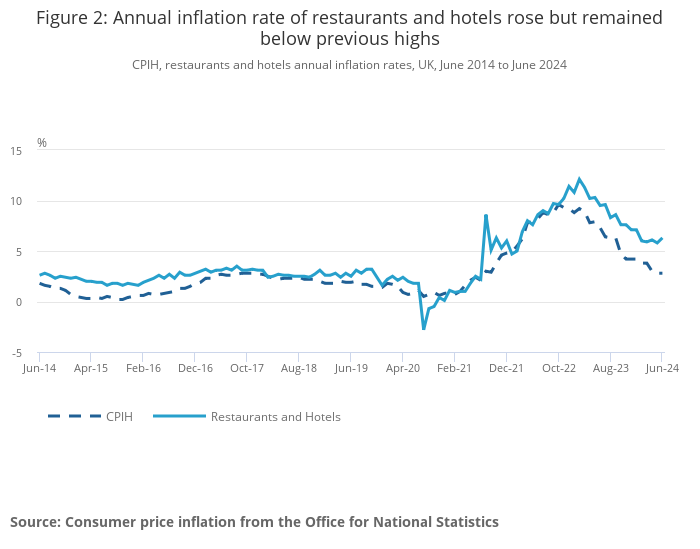 Prices for restaurants and hotels rose by 0.9% between May and June this year, compared with a lower monthly rise of 0.5% a year ago. The annual rate rose to 6.3% in the year to June 2024, up from 5.8% in the year to May.