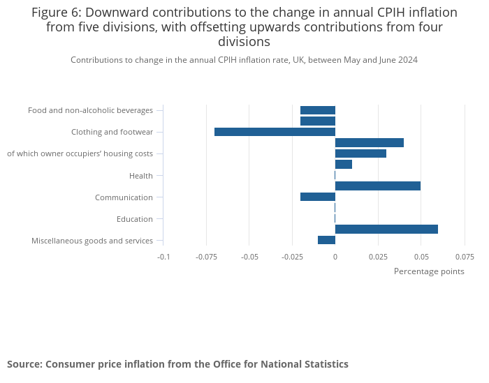 The annual CPIH inflation rate in June 2024 reflected downward contributions from five divisions, offset by upward contributions from four. The largest upward effects came from restaurants and hotels, transport and housing and household services. The largest downward effect came from clothing and footwear.