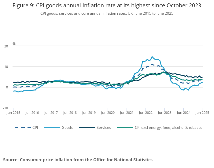 The CPI all goods index rose by 2.4% in the 12 months to June 2025, up from 2.0% in the 12 months to May. This is the highest rate since October 2023, when it was 2.9%.