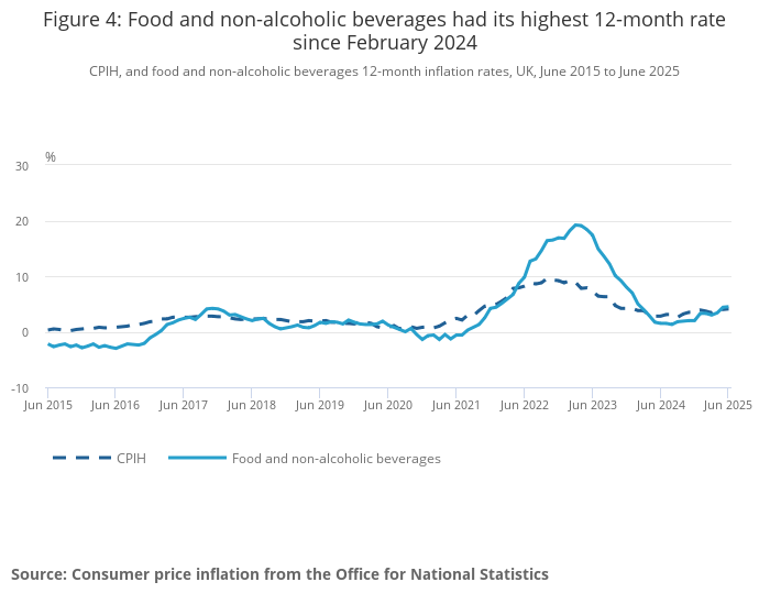 The Consumer Prices Index including owner occupiers’ housing costs (CPIH) rose by 4.1% in the 12 months to June 2025, up from 4.0% in the 12 months to May.