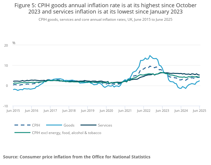 Core CPIH (CPIH excluding energy, food, alcohol, and tobacco) rose by 4.3% in the 12 months to June 2025, up slightly from 4.2% in the 12 months to May; the CPIH goods annual rate rose from 2.0% to 2.4%, while the CPIH services annual rate eased slightly from 5.3% to 5.2%.