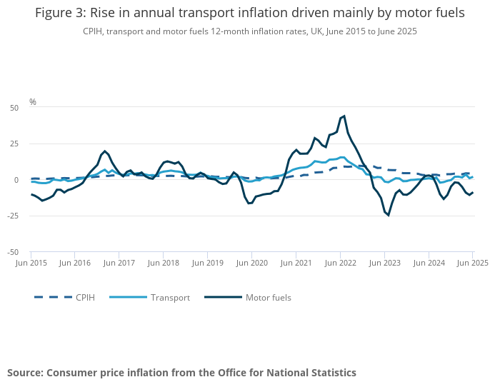 CPIH, transport and motor fuels 12-month inflation rates, UK, June 2015 to June 2025