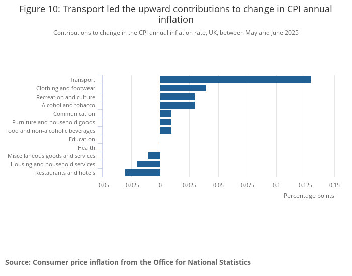 Contributions to change in the CPI annual inflation rate, UK, between May and June 2025