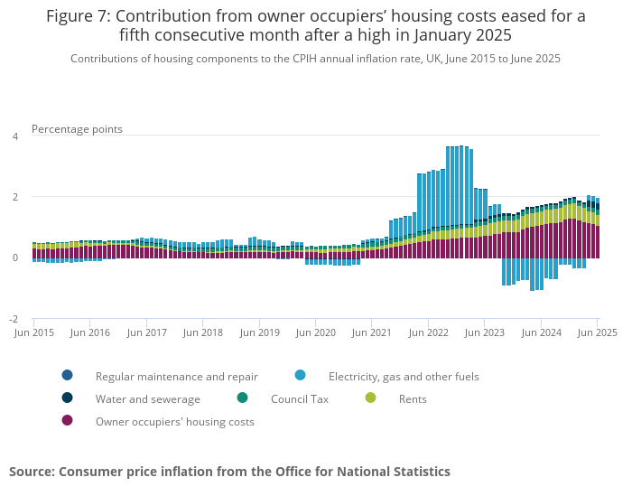 The easing in the 12-month rate between May and June 2025 mainly reflected a downward effect from owner occupiers' housing (OOH) costs, which rose by 6.4% in the year to June 2025. This was down from 6.7% in the year to May 2025. The June figure was the lowest recorded since March 2024, when the rate was 6.3%.