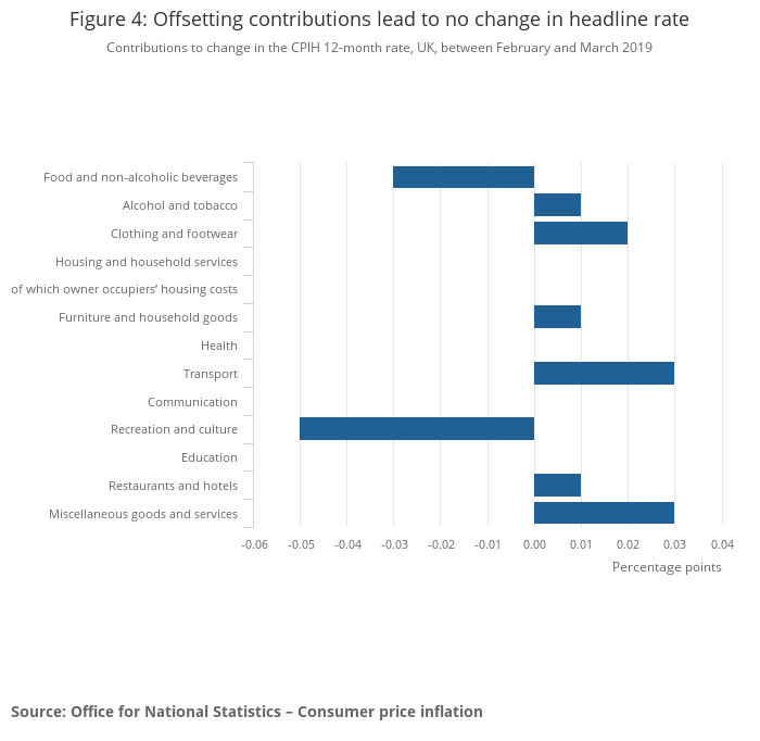 Figure 4 shows how each of the main groups of goods and services contributed to change in the Consumer Prices Index including owner occupiers’ housing costs (CPIH) 12-month rate between February and March 2019. The corresponding figures for the Consumer Prices Index (CPI) can be found in column F of Table 26 in the Consumer price inflation dataset.