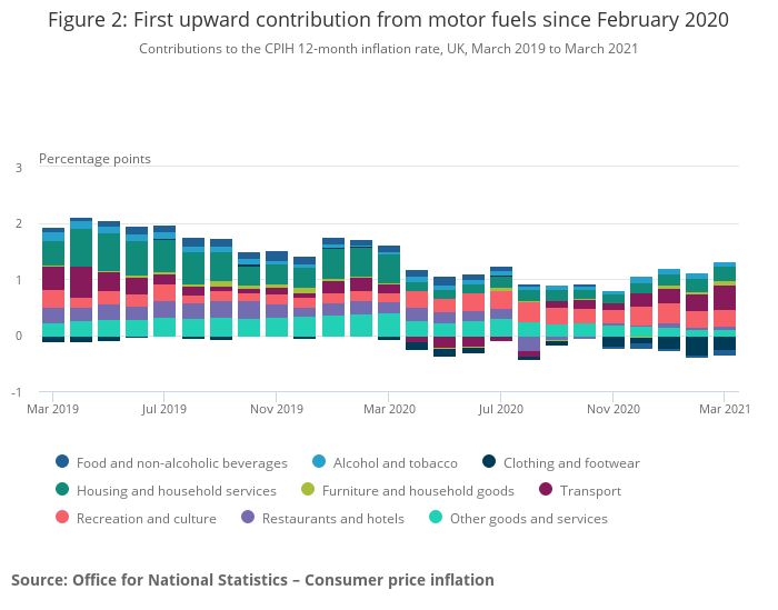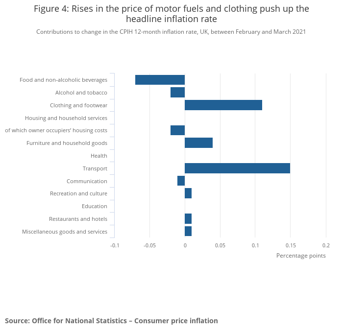 Image .csv .xlsFigure 4 shows how each of the main groups of goods and services contributed to the change in the Consumer Prices Index including owner occupiers’ housing costs (CPIH) 12-month inflation rate between February and March 2021. The corresponding figures for the Consumer Prices Index (CPI) can be found in Column F of Table 26 in the Consumer price inflation dataset.