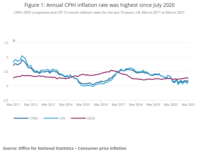 The Consumer Prices Index including owner occupiers’ housing costs (CPIH) rose by 1.0% in the 12 months to March 2021, up from 0.7% to February.