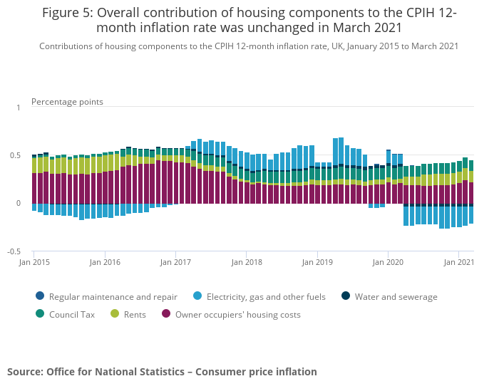 In March 2021, the contribution of housing components to the CPIH 12-month inflation rate was 0.24 percentage points, unchanged from February. The contribution has been relatively low since April 2020 (in contrast with contributions in excess of 0.50 percentage points at the start of 2020) as a result of reduced contributions from electricity, gas, liquid fuels, water supply and sewerage collection.