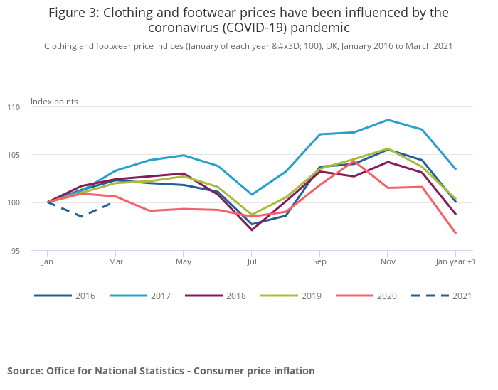 Following a slight rise in December 2020, prices fell as usual into January 2021. They then fell by a further 1.5% into February before rising by 1.6% in March. This latest rise partly unwinds the unusual fall into February and reflects the patterns of price discounting in the sector. Normally the amount of discounting falls between January and February, and again between February and March as the winter sales season ends and spring fashions enter the shops. This year, there was increased discounting in February potentially caused by the coronavirus (COVID-19) pandemic leading to delays in selling off winter stock. The amount of discounting has fallen back in March but despite the fall back, levels of discounting are still high for the time of year.