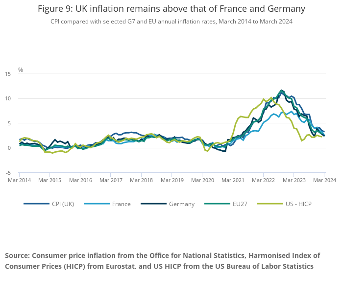 CPI compared with selected G7 and EU annual inflation rates, March 2014 to March 2024