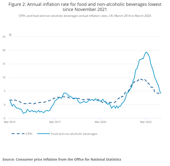 Prices for food and non-alcoholic beverages rose by 4.0% in the year to March 2024, down from 5.0% to February. The March figure is the lowest annual rate since November 2021. The rate has eased for the 12th consecutive month from a recent high of 19.2% in March 2023, the highest annual rate seen for over 45 years.