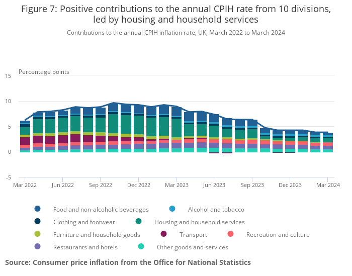 The unchanged Consumer Prices Index including owner occupiers’ housing costs (CPIH) annual inflation rate in March 2024 reflected offsetting contributions from the different product groups. There were downward contributions from five divisions, most notably food and non-alcoholic beverages, offset by upward contributions from three divisions, particularly housing and household services.