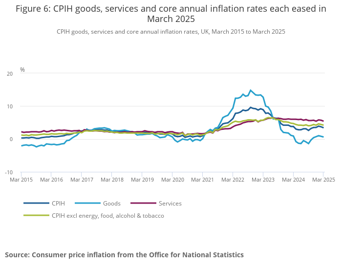- Core CPIH (excluding energy, food, alcohol and tobacco) rose by 4.2% in the 12 months to March 2025, down from 4.4% in the 12 months to February; the CPIH goods annual rate eased from 0.8% to 0.6%, while the CPIH services annual rate slowed from 5.7% to 5.4%.