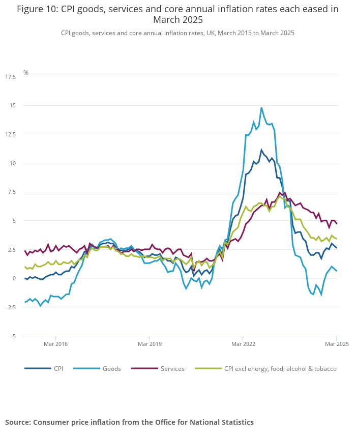 CPI goods, services and core annual inflation rates, UK, March 2015 to March 2025