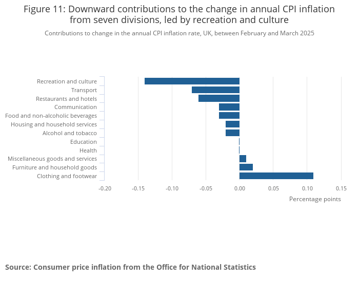 Contributions to change in the annual CPI inflation rate, UK, between February and March 2025