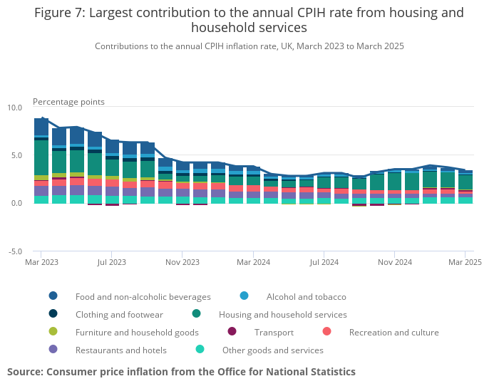 The CPIH includes extra housing components not included in the CPI. This can result in the largest contributions to the annual CPI and CPIH inflation rates coming from different divisions. In March 2025, the largest-contributing division to CPI was restaurants and hotels (0.43 percentage point contribution to the CPI rate) whereas the largest-contributing division to CPIH was housing and household services (1.51 percentage points to the CPIH rate). OOH costs had a large upward contribution to housing and household services in CPIH but are excluded from CPI.