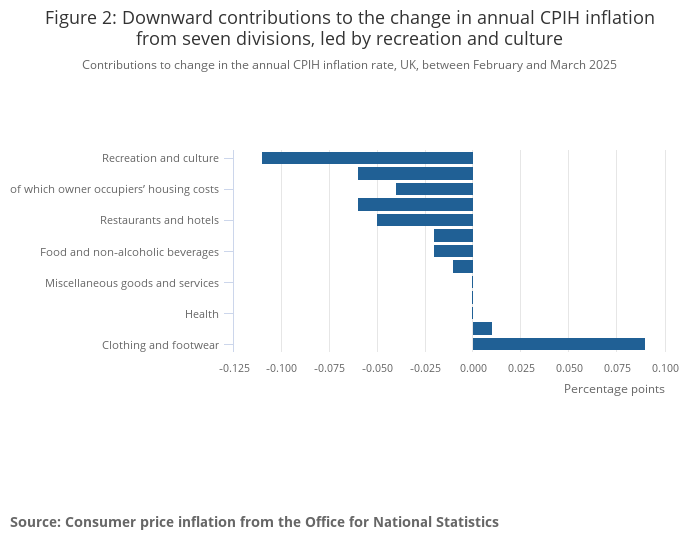 Contributions to change in the annual CPIH inflation rate, UK, between February and March 2025