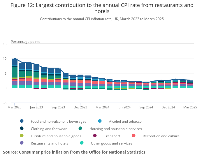 Contributions to the annual CPI inflation rate, UK, March 2023 to March 2025