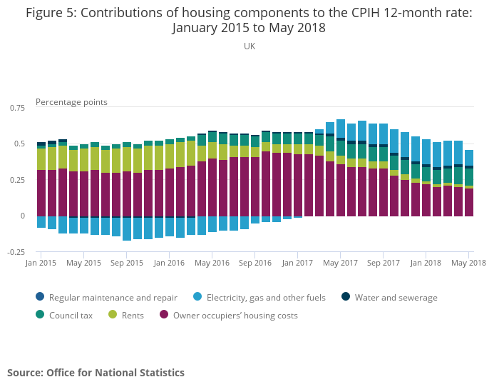 Figure 4 shows how each of the main groups of goods and services contributed to the change in the Consumer Prices Index including owner occupiers’ housing costs (CPIH) 12-month rate between April and May 2018. The corresponding figures for the Consumer Prices Index (CPI) can be found in column F of Table 26 in the Consumer price inflation dataset.