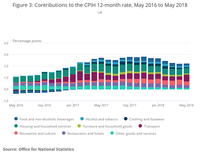 The largest upward contribution to the CPIH 12-month rate came from transport, where prices rose by 4.6% in the year to May 2018 leading to a contribution of 0.58 percentage points to the CPIH 12-month rate. The May 2018 rate for transport is the highest since April 2017 when it was 6.2%. Housing and household services continues to make a large upward contribution (of 0.47 percentage points in May 2018), though for the first time since April 2017, it is not the largest contribution.