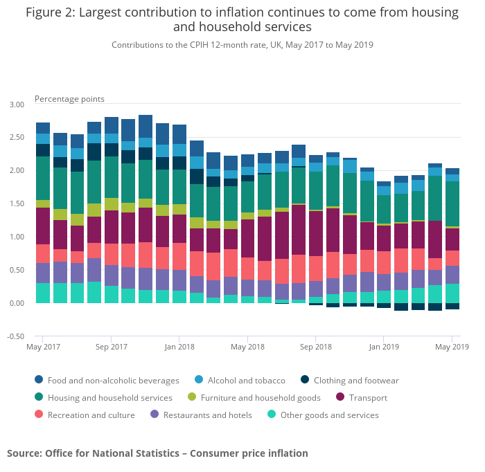 The Consumer Prices Index including owner occupiers’ housing costs (CPIH) 12-month inflation rate was 1.9% in May 2019, down from 2.0% in April 2019.