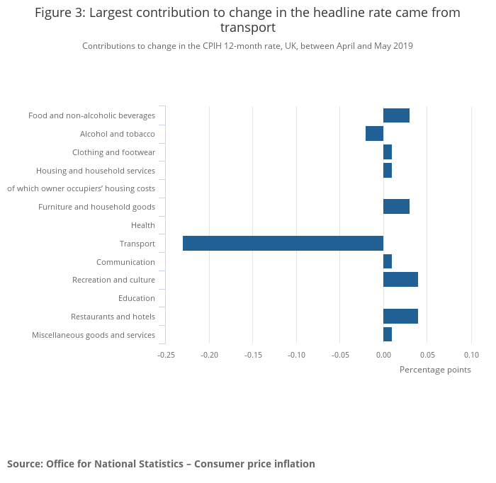Image .csv .xlsFigure 3 shows how each of the main groups of goods and services contributed to the change in the Consumer Prices Index including owner occupiers’ housing costs (CPIH) 12-month rate between April and May 2019. The corresponding figures for the Consumer Prices Index (CPI) can be found in column F of Table 26 in the Consumer price inflation dataset.