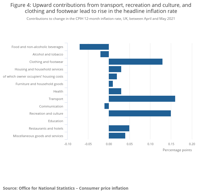 Image .csv .xlsFigure 4 shows how each of the main groups of goods and services contributed to the change in the Consumer Prices Index including owner occupiers’ housing costs (CPIH) 12-month inflation rate between April and May 2021. The corresponding figures for the Consumer Prices Index (CPI) can be found in Column F of Table 26 in the Consumer price inflation dataset.