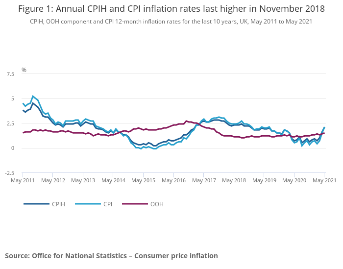 - The Consumer Prices Index including owner occupiers’ housing costs (CPIH) rose by 2.1% in the 12 months to May 2021, up from 1.6% to April.