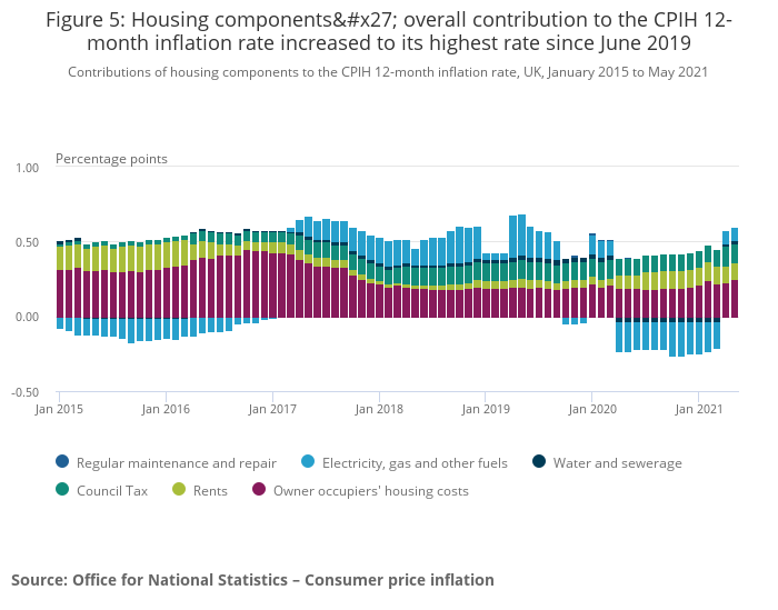Image .csv .xlsFigure 5 shows the contribution of owner occupiers’ housing costs (OOH) and Council Tax to the Consumer Prices Index including owner occupiers’ housing costs (CPIH) 12-month inflation rate in the context of wider housing-related costs. In May 2021, the contribution of housing components to the CPIH 12-month inflation rate was 0.60 percentage points, its highest contribution since June 2019.