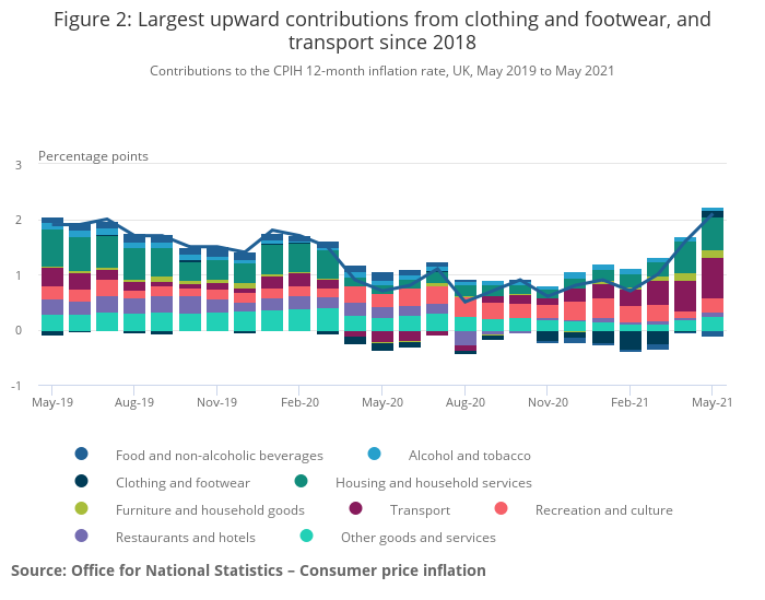- Rising prices for clothing, motor fuel, recreational goods (particularly games and recording media), and meals and drinks consumed out resulted in the largest upward contributions to the change in the CPIH 12-month inflation rate between April and May 2021.