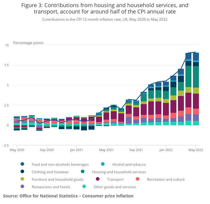 - The largest upward contributions to the annual CPIH inflation rate in May 2022 came from housing and household services (2.79 percentage points, principally from electricity, gas and other fuels, and owner occupiers' housing costs) and transport (1.50 percentage points, principally from motor fuels and second-hand cars).