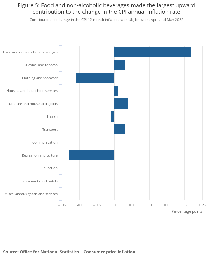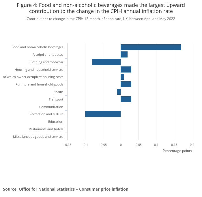 Rising prices for food and non-alcoholic beverages, compared with falls a year ago, resulted in the largest upward contribution to the change in both the CPIH and CPI 12-month inflation rates between April and May 2022 (0.17 percentage points for CPIH).