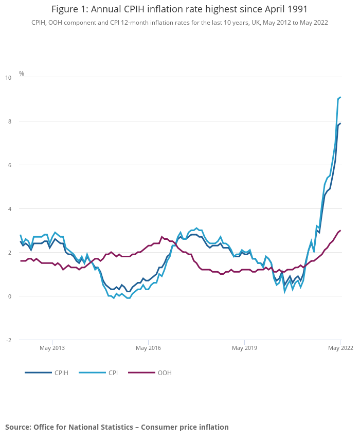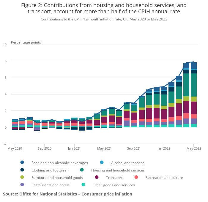 - The Consumer Prices Index including owner occupiers' housing costs (CPIH) rose by 7.9% in the 12 months to May 2022, up from 7.8% in April.