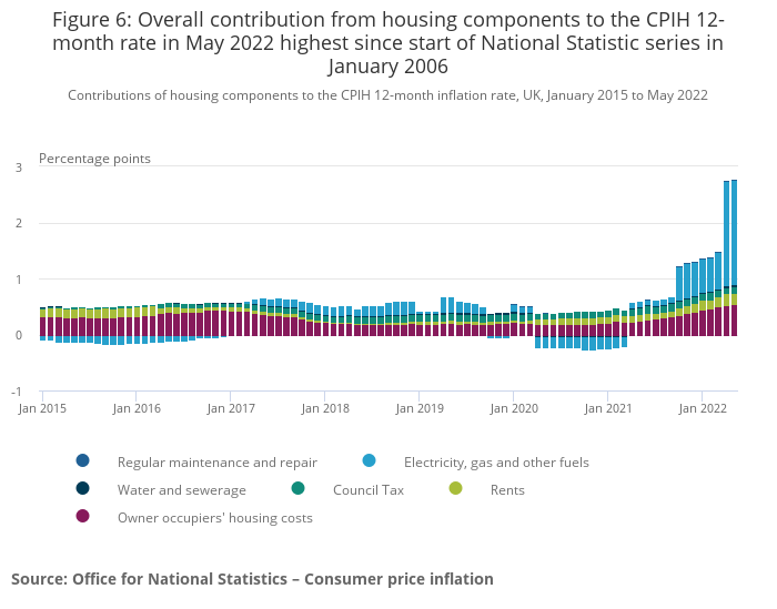 Image .csv .xlsFigure 6 shows the contribution of owner occupiers’ housing costs (OOH) and Council Tax to the Consumer Prices Index including owner occupiers’ housing costs (CPIH) 12-month inflation rate in the context of wider housing-related costs. In May 2022, the contribution of housing and household services in total to the CPIH 12-month inflation rate was 2.79 percentage points, a rise of 0.03 percentage points from April. The May figure was the highest in the National Statistic series, which began in January 2006.