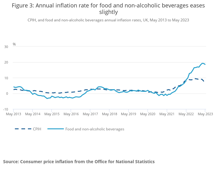 Food and non-alcoholic beverage prices rose by 18.4% in the year to May 2023, down from 19.1% in April and from 19.2% in March, which was the highest annual rate seen for over 45 years. The latest easing in the annual rate reflects a monthly rise of 0.9% between April and May 2023, compared with a larger 1.5% increase between the same two months a year ago.
