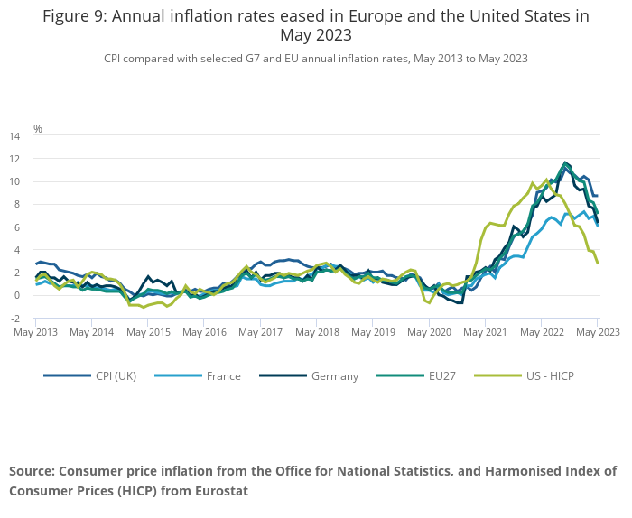 - The Consumer Prices Index including owner occupiers' housing costs (CPIH) rose by 7.9% in the 12 months to May 2023, up from 7.8% in April.
