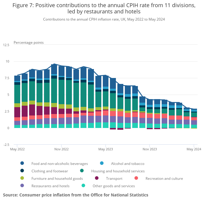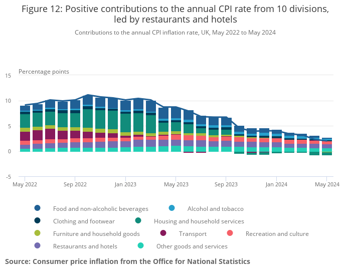 Contributions to the annual CPI inflation rate, UK, May 2022 to May 2024