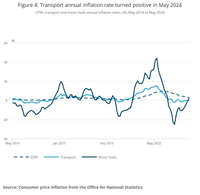 CPIH, transport and motor fuels annual inflation rates, UK, May 2014 to May 2024