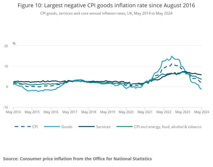 CPI goods, services and core annual inflation rates, UK, May 2014 to May 2024