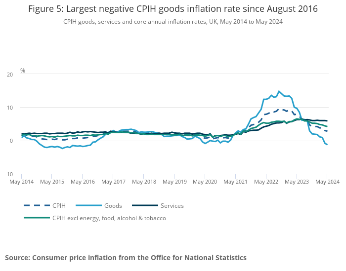 Core CPIH (excluding energy, food, alcohol and tobacco) rose by 4.2% in the 12 months to May 2024, down from 4.4% in April; the CPIH goods annual rate fell from negative 0.8% to negative 1.3%, while the CPIH services annual rate eased slightly from 6.0% to 5.9%.