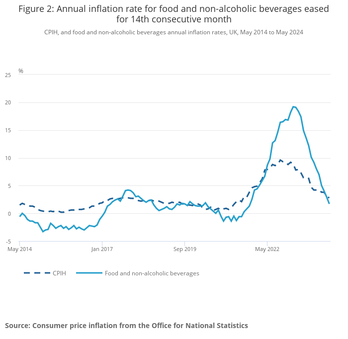 Prices of food and non-alcoholic beverages rose by 1.7% in the year to May 2024, down from 2.9% in the year to April. The May figure is the lowest annual rate since October 2021. The rate has eased for the 14th consecutive month from a recent high of 19.2% in March 2023, the highest annual rate seen for over 45 years.