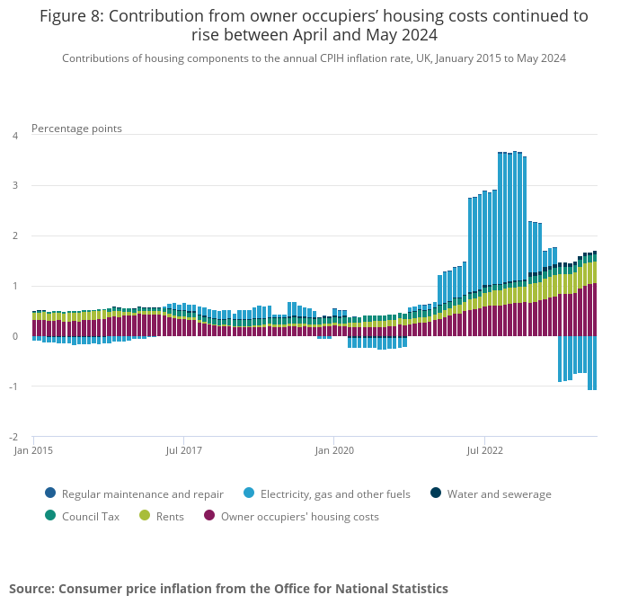 The owner occupiers’ housing costs (OOH) component of CPIH rose by 6.7% in the 12 months to May 2024, up from 6.6% in the 12 months to April. This is the highest annual rate since July 1992 in the constructed historical series. OOH costs rose by 0.6% on the month, compared with a 0.5% increase between April and May 2023.
