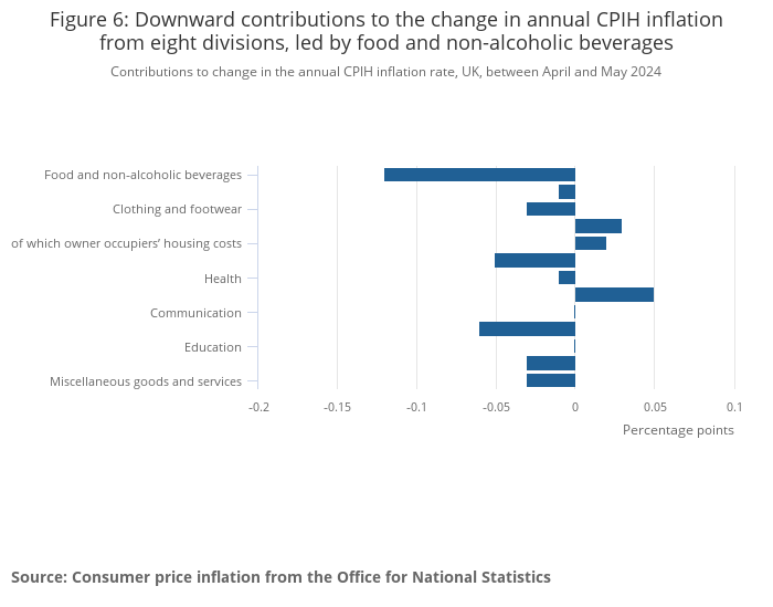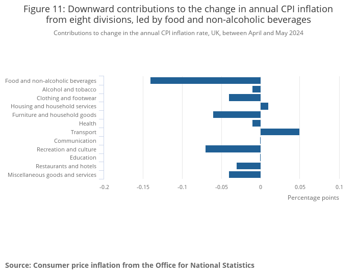 Contributions to change in the annual CPI inflation rate, UK, between April and May 2024