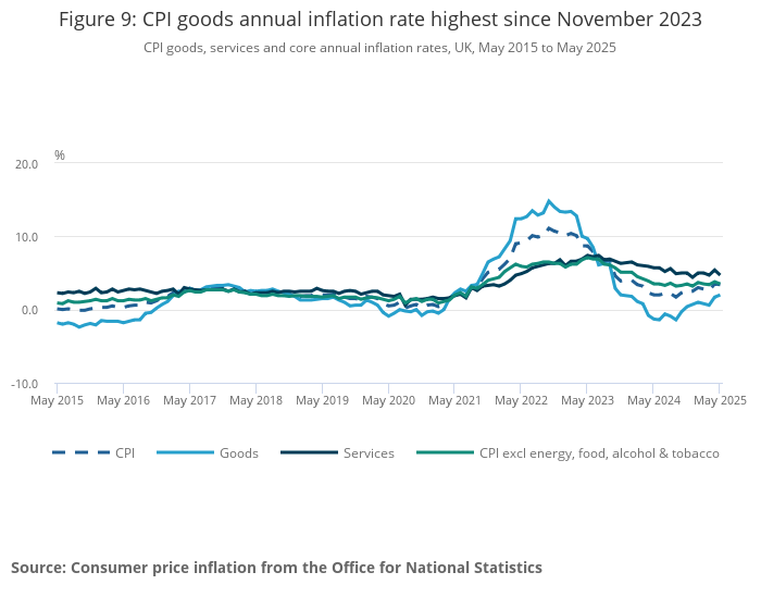 The CPI all goods index rose by 2.0% in the 12 months to May 2025, up from 1.7% in the 12 months to April. This is the highest rate since November 2023 when it was also 2.0%. It was last higher in October 2023.