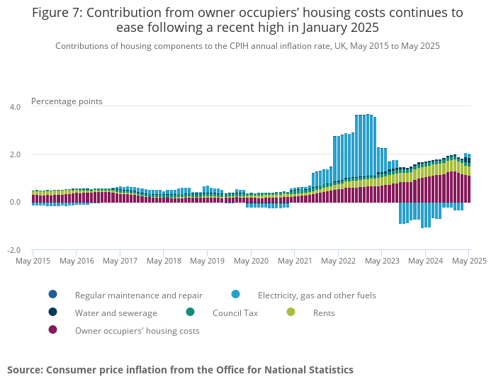 The easing in the 12-month rate between April and May 2025 principally reflected a downward effect from owner occupiers' housing (OOH) costs, which rose by 6.7% in the year to May 2025. This was down from 6.9% in the year to April 2025, and was the lowest 12-month rate seen since May 2024, when the rate was also 6.7%.