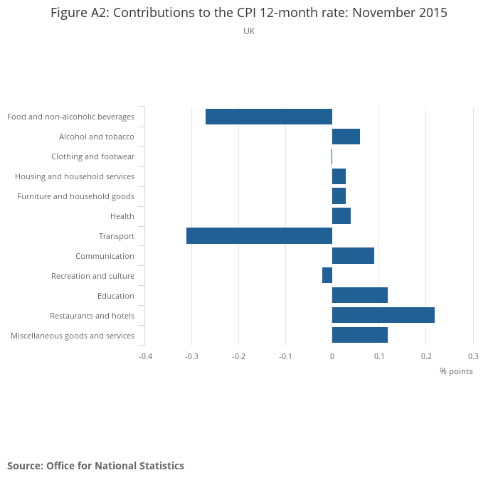 Figure A shows the contributions to the CPI 12-month rate in November 2015 compared with the contributions to the 12-month rate a year earlier. A larger version of the chart can be viewed by clicking on it (HTML version only).
