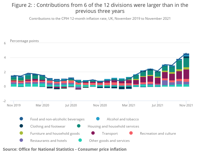 The largest upward contributions to the November 2021 CPIH 12-month inflation rate came from transport (1.34 percentage points, principally from motor fuels and second-hand cars) and housing and household services (1.28 percentage points).