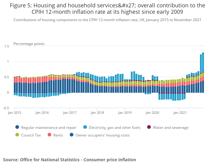 Image .csv .xlsFigure 5 shows the contribution of owner occupiers’ housing costs (OOH) and Council Tax to the Consumer Prices Index including owner occupiers’ housing costs (CPIH) 12-month inflation rate in the context of wider housing-related costs. In November 2021, the contribution of housing and household services to the CPIH 12-month inflation rate was 1.28 percentage points, an increase of 0.05 percentage points from October 2021.