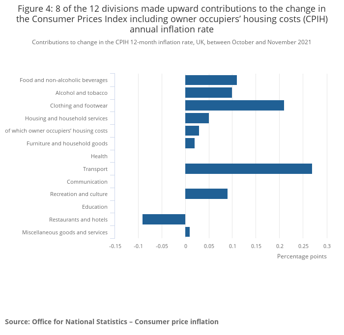 Image .csv .xlsFigure 4 shows how each of the main groups of goods and services contributed to the change in the Consumer Prices Index including owner occupiers’ housing costs (CPIH) 12-month inflation rate between October and November 2021. The corresponding figures for the Consumer Prices Index (CPI) can be found in Column F of Table 26 in the Consumer price inflation dataset.
