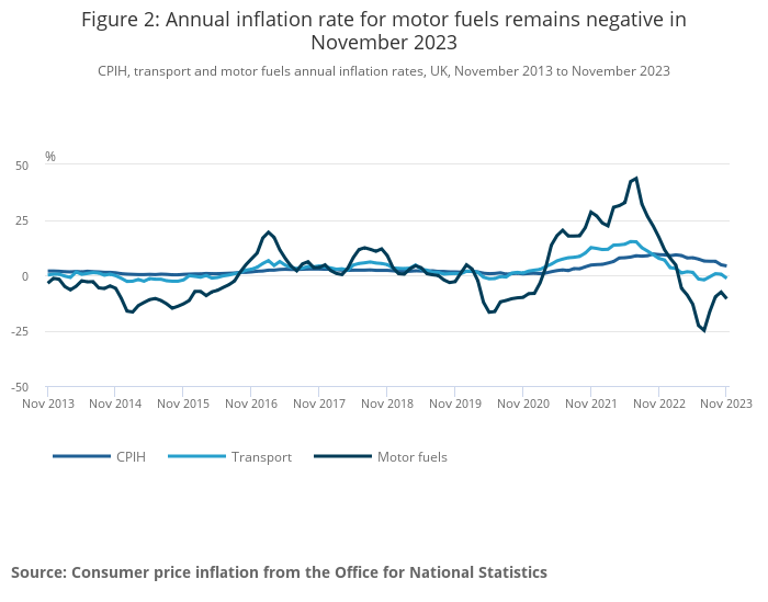 CPIH, transport and motor fuels annual inflation rates, UK, November 2013 to November 2023